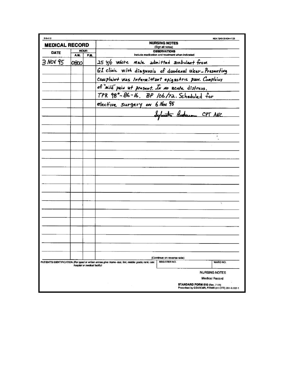 > Figure 6-1. Example of a SF 510, Nursing Notes, showing an admitting entry. - Taking Vital Signs