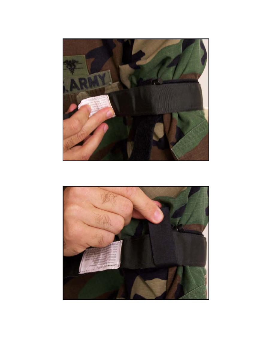 > Figure 2-20. Grasp the windlass strap, pull it tight, and adhere it to the Velcro on the windlass clip. - Tactical Combat Casualty Care and Wound Treatment